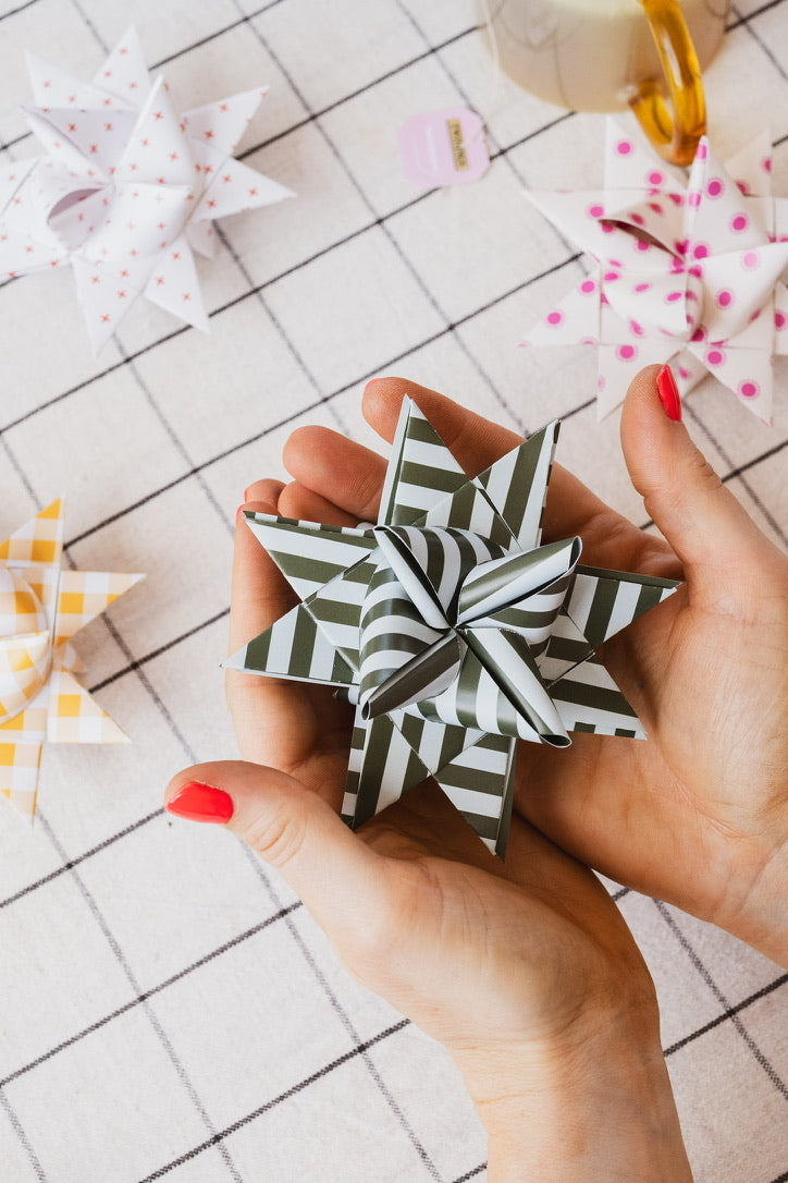 Beherrsche die Kunst der traditionellen deutschen Fröbelsterne mit diesem All-in-One-Papierfaltset.