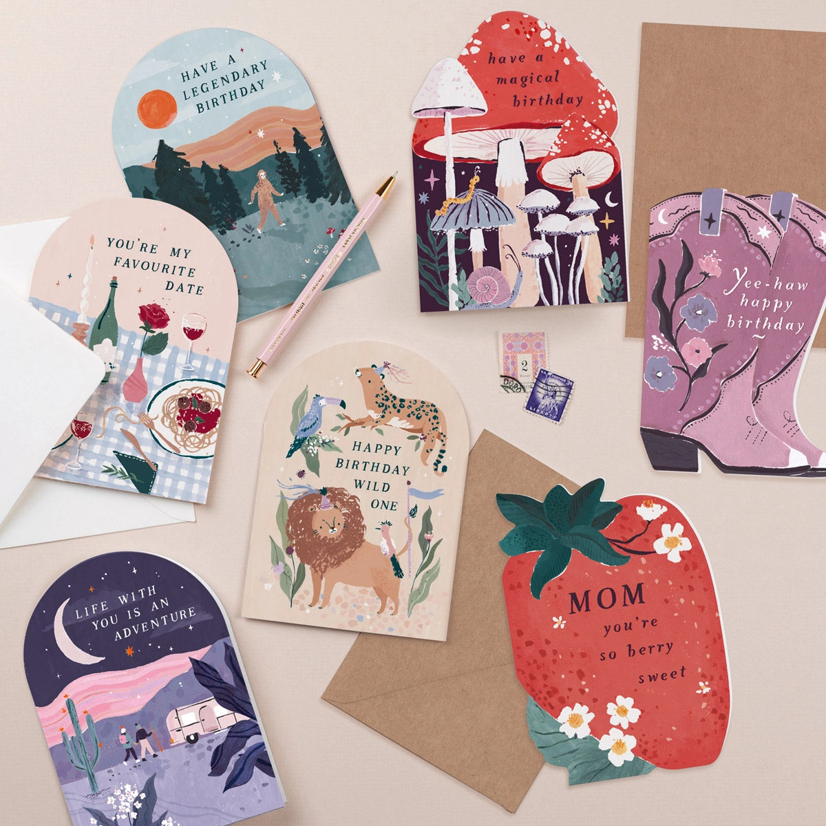 Einzigartig geformte Karte. Der Umschlag ist aus 100% recyceltem Papier, Innen blanko, aus nachhaltigen Wäldern.